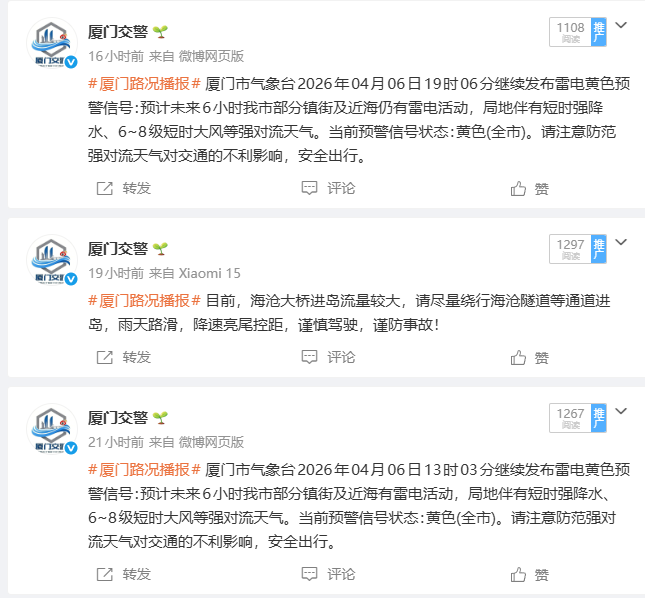 △“厦门交警”新媒体矩阵及时提供出行引导提示。