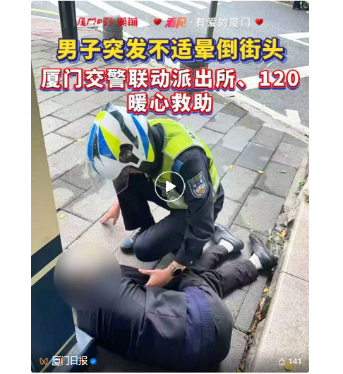 △贴心帮扶、暖心服务。 △4月5日上午,开元交警中队指导员林寿星执勤时,及时救助突发晕倒男子。