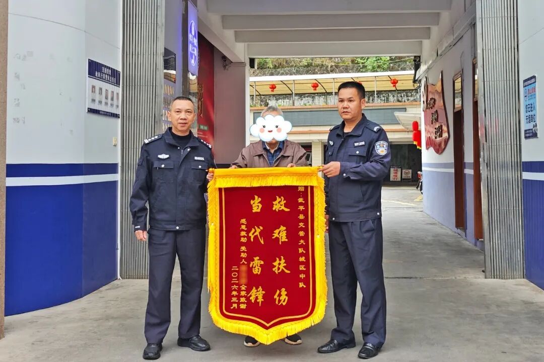 近日 武平县公安局交通管理大队 收到群众送来的印有 “救难扶伤 当代雷锋” 字样的锦旗 感谢民警辅警 及时救助他的家人