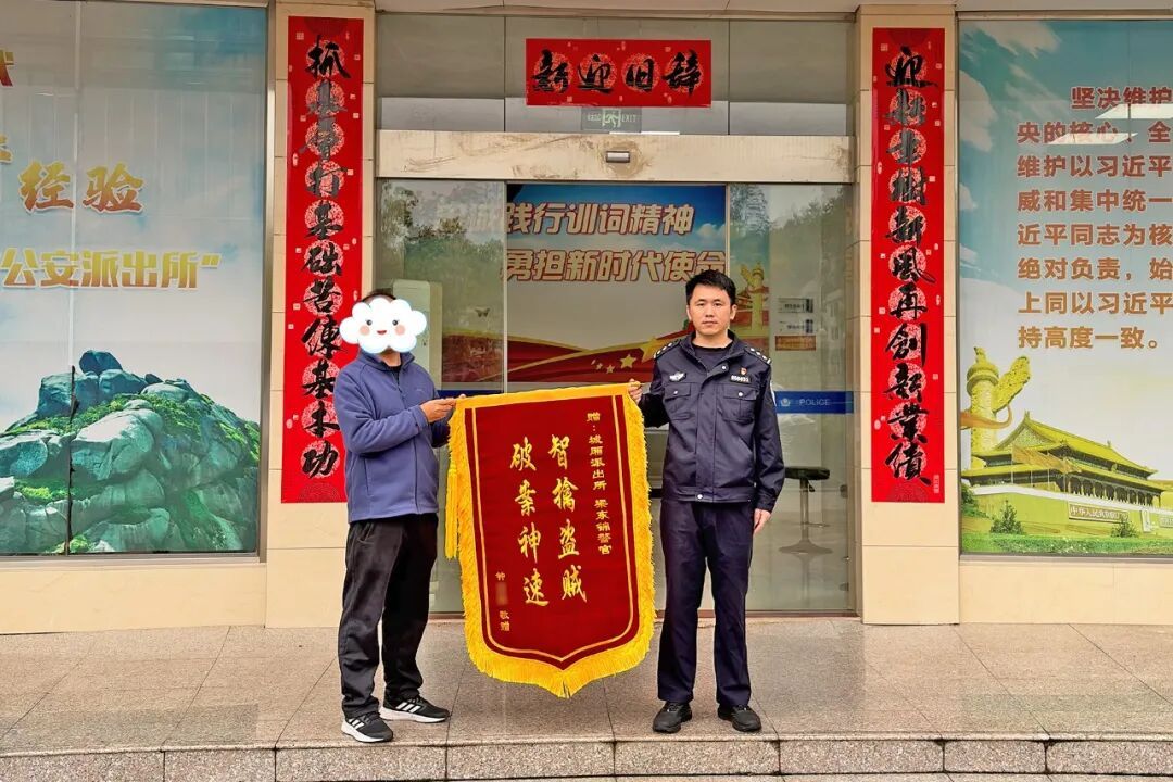 近日 群众钟先生 将一面写有 “智擒盗贼 破案神速” 字样的锦旗 送到城厢派出所 感谢民警辅警 为其找回被盗财物
