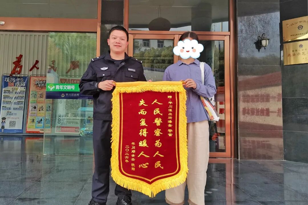 近日 市民邓女士将一面印有 “人民警察为人民 失而复得暖人心” 字面的锦旗送到 平川派出所 感谢民警辅警 帮其找回丢失的手机