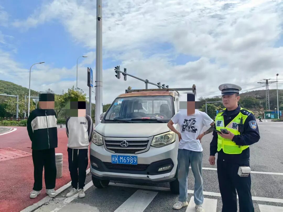 4月2日16时许,平潭交警在中山大道兴港路附近查获一辆轻型普通货车,存在3项违法:车辆未按规定定期进行安全技术检验、载货汽车违规载客、故意遮挡号牌。民警当场对驾驶员进行批评教育、依法处罚,并责令立即转运超员人员。