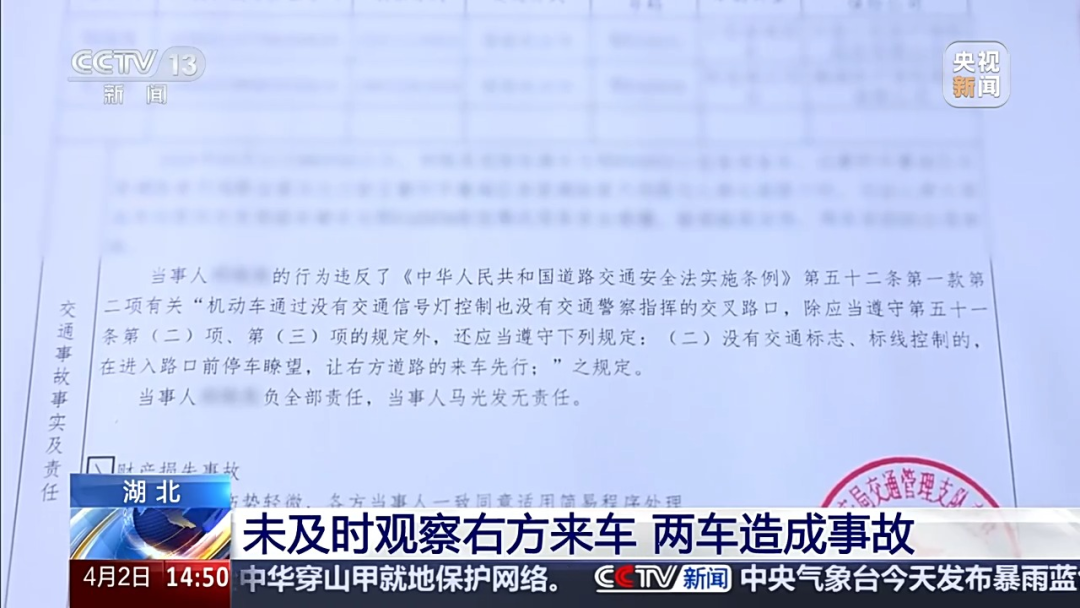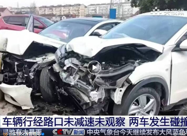 襄阳市公安局交通管理支队交警一大队民警 肖龙:白色小车沿路口由南向北行驶时,没有及时注意观察到右方的小货车。两辆车行驶至路口时,等白色小车发现时已来不及刹车,最终,两车在交叉口中心位置发生了碰撞。 白色SUV驾驶人:就是当时先看的左边,右边没看到。