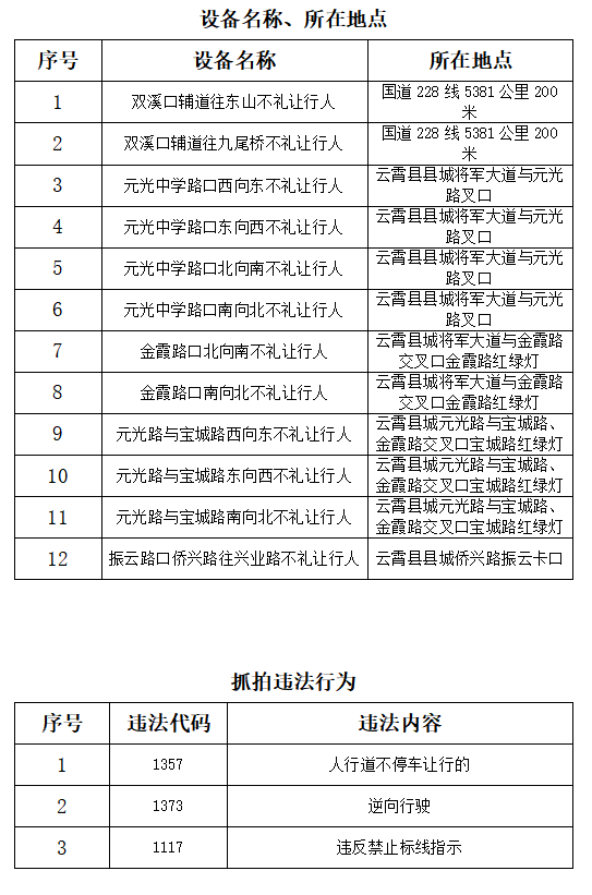 为进一步规范云霄县道路交通秩序,有效预防和减少道路交通事故,创建安全、畅通、有序的道路交通环境,现将云霄县新增的交通违法采集设备安装地点、违法行为内容及违法代码公告如下,并依照《中华人民共和国道路交通安全法》有关规定对违法车辆进行抓拍处罚,望广大驾驶人员相互转告,自觉遵守交通法律法规,安全文明出行,共同维护道路交通秩序。